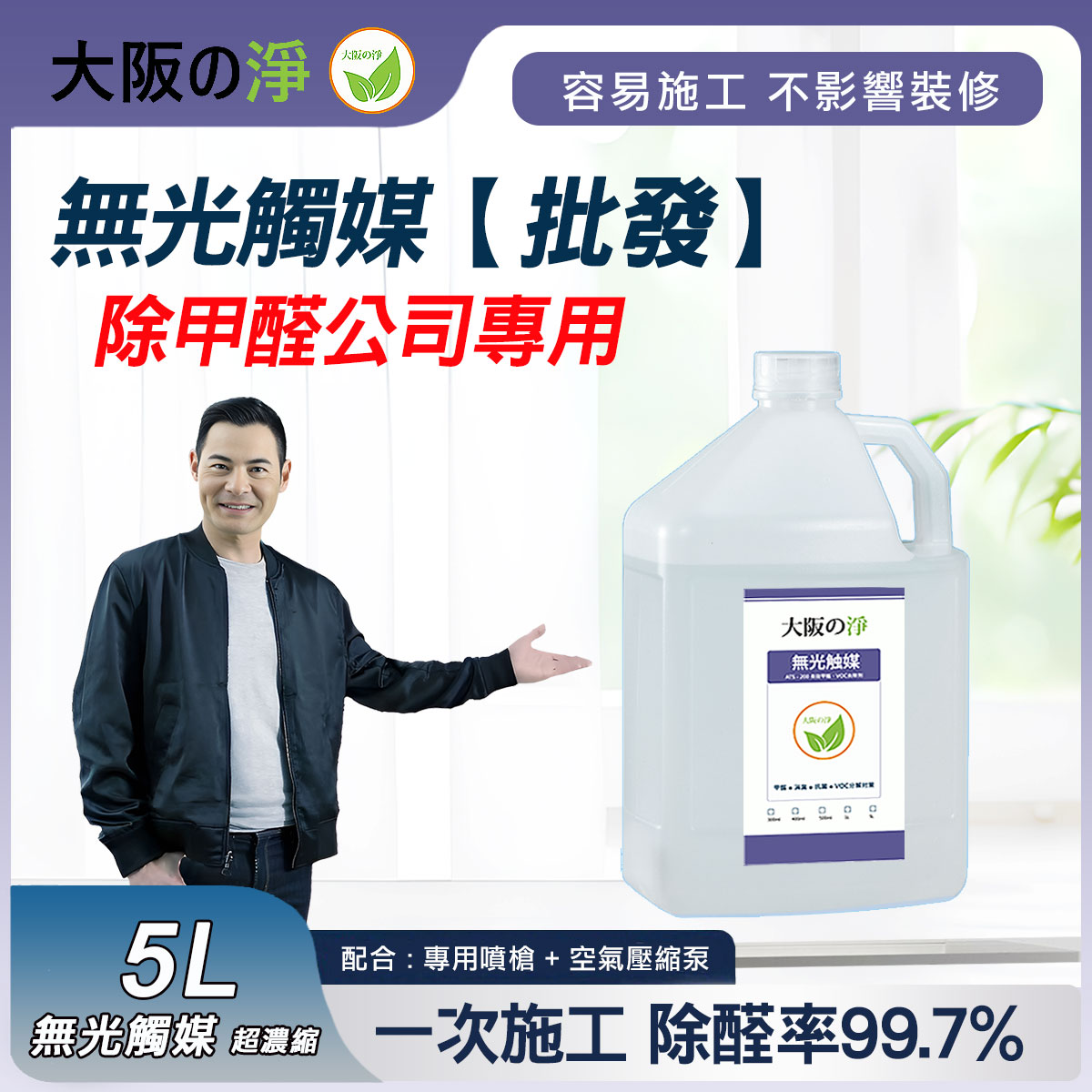 (a) 無光觸媒 – 噴塗牆身,天花,傢俬表面及內部,窗簾,梳化,床,櫃,地氈,玩具等等 (玻璃及金屬不需要噴塗)。全屋形成除甲醛保護膜。